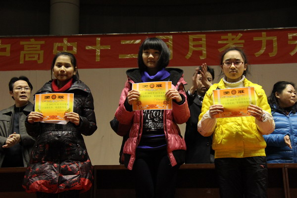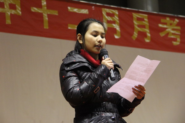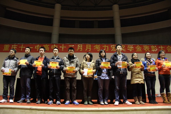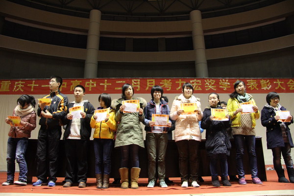 12月27日晚,我校高2014级全体师生在体育馆召开了期末复习动员会暨12月月考力宏奖学金表彰大会。参加此次会议的领导有李建兵副主任、马凯组长、余文姜老师、刘翠碧老师、蒲可夫老师、艾林老师。本次表彰主要是针对在12月的月考中取得优异成绩和较大进步同学。