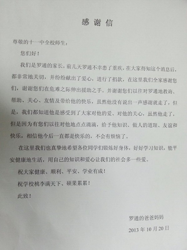 重庆十一中师生为罗通同学爱心捐款名单公示
