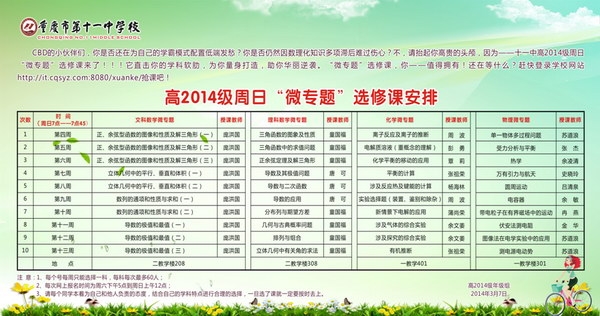 开学伊始,在学校的正确领导与各部门的有力配合下,高2014级各项工作有序而稳步的进行。在李顺林副校长的指导下,年级领导小组全体成员反复探讨抓重点踩线生的工作,细致分析本年级的实际情况,精心设计有效方案,最后取得共识,决定从第四周星期日晚开始,先开设文理数学、物理、化学微专题。各备课组首先根据“考纲”要求与学生实际选出突出的十个微专题,然后通过备课组推荐与学生邀请相结合的方式选定主讲教师,再把主讲教师及其专题名挂在学校网站上,最后由学生上网抢名额。由于系统的疏漏,还没到规定时间,学生已经在8号上午12点左右抢完名额。为公平起见,年级及时协调,临时增加了120个名额。3月9日晚上7点整,化学周波老师,物理苏道浪老师,数学庞洪国老师、童国福老师准时开讲,学生提前争先恐后到指定教室。老师精辟的分析讲解,让同学们茅塞顿开,信心倍增。