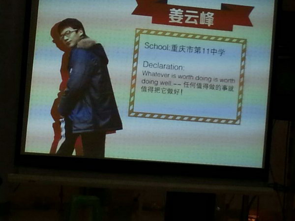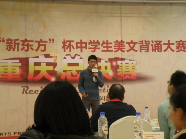 2014年3月15日,由新东方重庆学校主办的第七届“新东方杯”中学生美文背诵大赛重庆总决赛场完美收官。比赛当日,通过层层PK,最终我校高2016级9班姜云峰同学获得了全市高中组亚军。