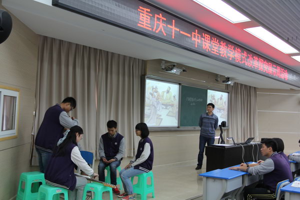 这是一篇选自《论语》的课文,由于年代久远,阅读障碍非常大。所以学生的预习也特别重要。贯彻先学后教的原则,两位老师从字词的预习检查入手,了解学生的预习情况。况玲老师以三个具有梯度的问题——“孔子问了什么问题?”“学生的回答是什么?”以及“孔子更喜欢谁的回答?为什么?”简明扼要地贯穿了整个课堂。在学生的讨论与回答中,引导学生对课文本身的难点进行了梳理,同时也启发学生了对于孔子的深入理解和重新发现。岳廷松老师则以课本剧的演和评来完成学生对课文的理解。表演学生对人物的演绎十分精彩,而评论同学也热情高涨。在评价表演的过程中,学生们对于文本和人物性格有了更好的理解把握,也对《论语》有了新鲜的认识。在两位老师的设计下,这篇古老的文段,又焕发出新的生命力。