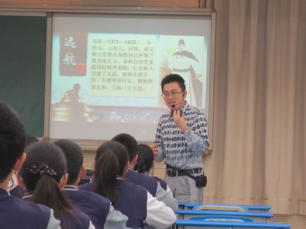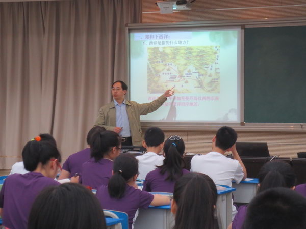 2014年4月21日,初2016级的两位历史老师杨万华和童朋飞在学校多媒体教室一室进行了关于《明朝对外经济文化交流》的同课异构教学活动。根据学校的“先学后教,以学定教”的课改要求,两位老师都根据学生的实际情况进行了相应的教学活动设计。杨万华老师采用的是材料问题教学法,通过问题的设计层层递进,引导学生在活动中一步一步的跟随问题层层深入,同时采用多种方法进行教学活动。在教学内容上不仅仅局限于课本当中的知识,同时还增加很多课外的知识,不仅仅局限于历史知识,还把相应的地理,生物等相关的知识都进行了渗透。童朋飞老师则是根据学生的知识面丰富的特点进行了教学设计,更多的是让学生自己来进行教学活动,学生自己讲解,自己表演,在活动中增强学生的实际能力,充分体现了老师主导,学生主体的教育教学理念。