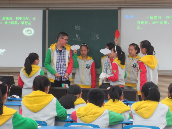 针对初一学生特点以及班级学生实际情况:杨曦老师从动画片《喜羊羊与灰太狼》入手激发学生兴趣,把学生对狼的认知由卡通形象引向文学形象;再从形象分析着手进行文言文教学重难点突破,即引导学生在文学形象的品读分析中把握文言词句;最后对比阅读《中山狼》,让学生更好更易去探讨课文主题。徒弟出手不凡,师傅当仁不让。胡茜老师则从狼的委屈入手,引发学生的思考,导入课文的诵读;再以课本剧为载体,巧妙运用文言重点词汇为表演评价依据,让学生在欢笑中轻松把握了那些曾经让师生们都觉得枯燥的文言词句。