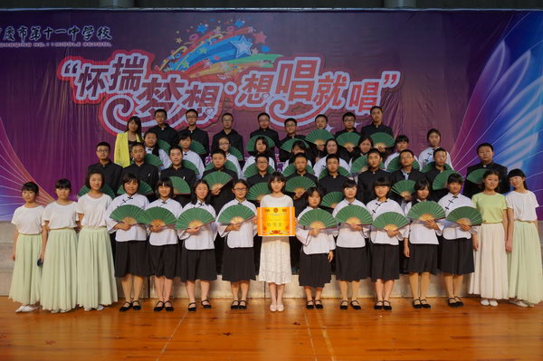在一个不大的舞台上,一群身着五四青年装,手拿碧绿折扇的他们,唱着一首悦耳的《送别+菊花台》。挥舞着的使他们最动人的感伤,歌唱着的是他们最灿烂的青春年华,时而高亢,时而低沉,时而婉转,时而悠扬。