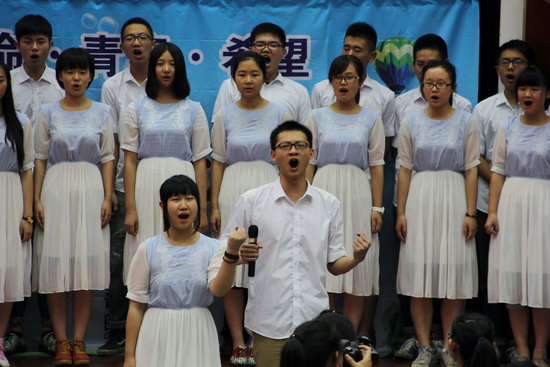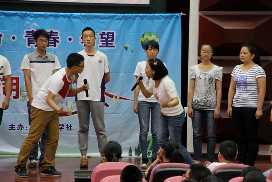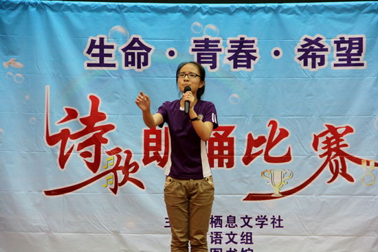 2014年6月3日,高2015级栖息在诗意的原野,绽放在浓情的初夏。由高2015级语文组、“栖息”文学社共同打造的“生命·青春·希望” 年级诗歌朗诵比赛正式举行,风格各异的个人朗诵、激情昂扬的集体表演,为闷热的夏天带来清新,为平静的校园增添灵气。
