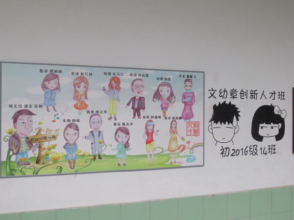 朋友,你是否也曾想过把老师画成卡通形象做成一面老师形象墙?是的,初2016级14班的同学们就做了这样的创新。