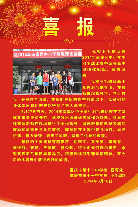 我校羽毛球队在2014年南岸区中小学生羽毛球比赛中获得高中组团体冠军。