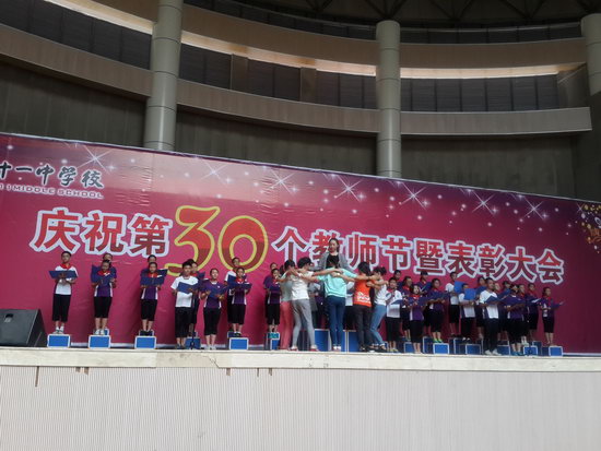 在十一中的体育馆内,老师们齐聚一堂,喜笑颜开地谈着天,期待着学生们为他们精心准备的节目。不一会儿,表演开始。