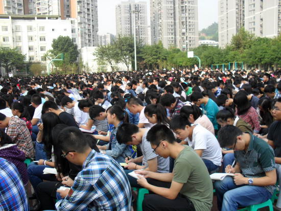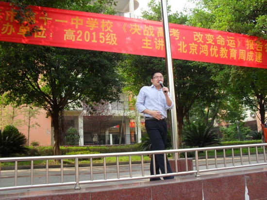 2014年10月26日下午3:00,来自北京鸿优教育的周成建老师为CBD全体学子献上了一场题为“决战高考,改变命运”的报告会。学生们早早地返校,在操场摆好各班的凳子,期待着周老师能带来一场别开生面的讲座。下午三点,阳光灿烂,CBD全体学子带着笔记本齐聚操场,讲座准时开始。