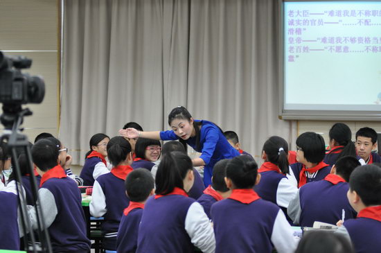 接着,来自南昌的罗田田老师则以一个手势魔术快速拉近了和学生的距离。罗老师在课堂中侧重让学生从文本阅读中概括人物的性格,总结童话故事中人物的共同特点——虚伪。并且让孩子在表演中感受人物的虚伪和作者对他们的讽刺。罗老师仪态优雅、声音甜美,言语幽默,互动自然,整堂课气氛活跃,学生参与度极高。