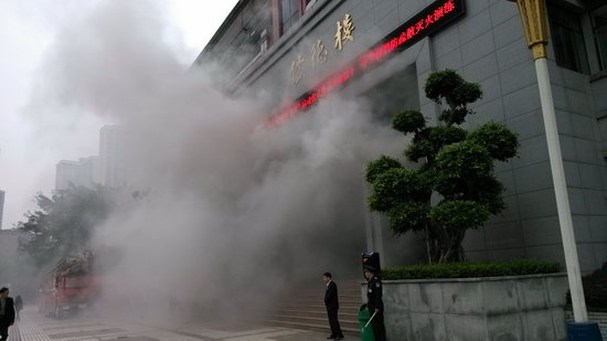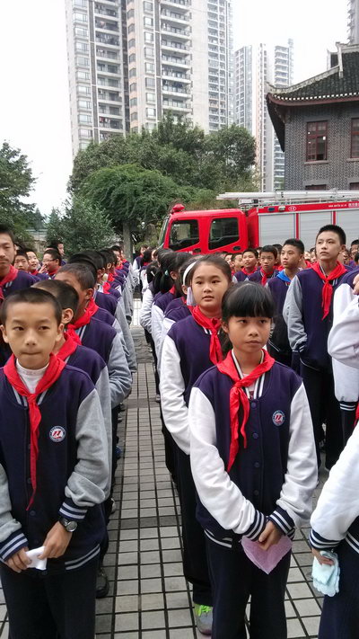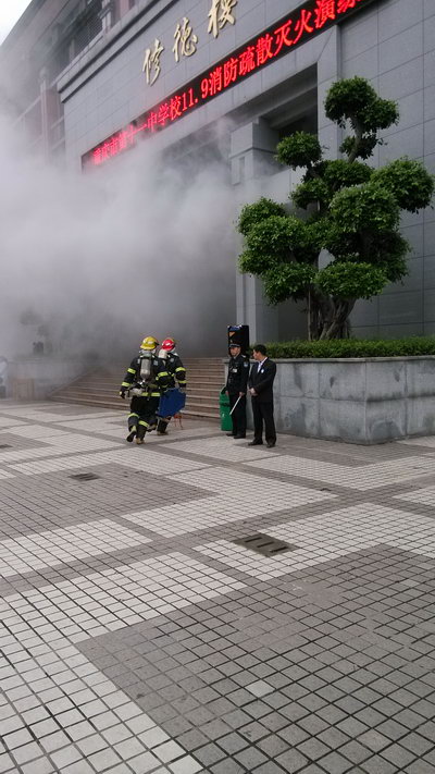 这是11月3日中午2:30在我校发生的惊心动魄的一幕。但只是虚惊一场,原来这是重庆市“11·9”消防宣传周活动启动仪式中举行的一场演练,目的是宣传消防知识,提高消防意识,让人人心中牢记“11·9”。