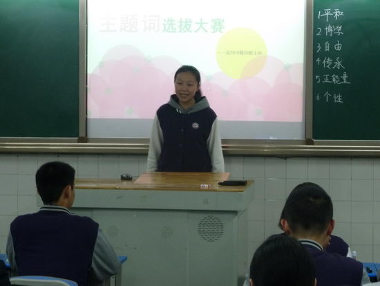 重庆十一中形象大使主题词选拔大赛高2016级20班分赛区总决赛于2014年11月3日晚6:10拉开帷幕。本次共有十一名同学各代表十一个主题词参赛。他们是“传承、正能量、爱国、宽容、健康、个性、平和、自由、自主学习、创新、博学”。同学们热情高涨,在一曲《What makes you beautiful》营造的欢快氛围中,十一名参赛选手轮流亮相,并都充满自信地说出了自己的参赛宣言。