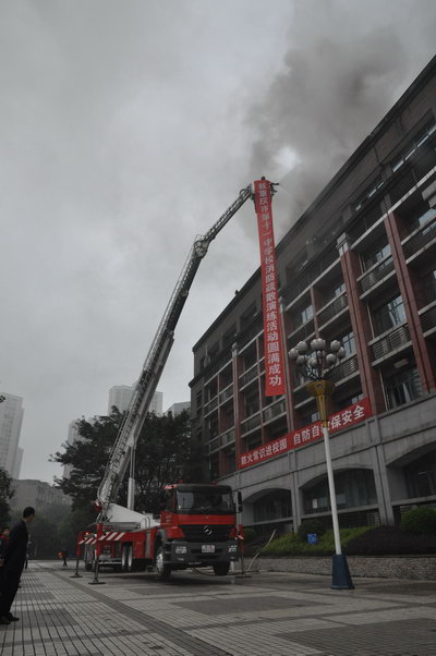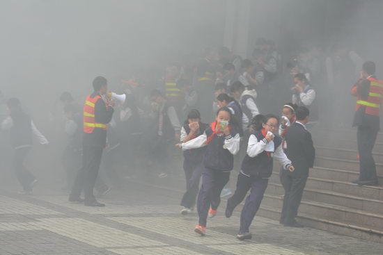 下午2:30,一声尖利的警报声划破了校园的宁静。浓烟滚滚,伸出利爪罩向教学楼。教室里正在上课的老师立即组织学生迅速有序离开教室,办公室里的老师立刻冲向走廊和楼梯口,指挥提醒学生捂鼻、低头、快速撤离。学生在前,老师断后,穿过浓烟,不到2分钟,全年级师生安全撤到平坦宽阔的广场。回望教学楼,教学楼已被浓烟包裹。数辆消防车火速进场,消防员戴上防烟面具冲进教学楼营救被困人员,消防车伸出长长的的手臂——云梯和高压水枪……不到10分钟,灭了“火源”,救出楼顶“被困人员”……
