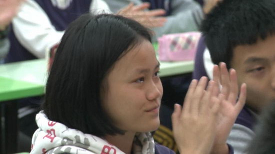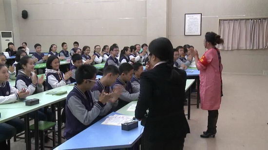 谭老师先给大家播放了一段小视频《一个人温暖一座城》,全国优秀志愿者、全国三八红旗手、感动重庆十大人物周纪萍30多年来义务照顾孤寡老人的感人事迹让在场全体师生无不震撼;接着学生朗诵感动重庆组委会授予的颁奖词更让大家对周幺婶的友善与执着佩服得五体投地;更让学生们欢欣鼓舞的是今天谭老师把周幺婶请到了我们的课堂与同学们面对面地交流,当周幺婶给大家分享自己的事迹时,一个个感动得潸然泪下;当同学们得知周幺婶从照顾孤寡老人到现在热心各项社区公益服务,从一个人到现在组建了200多人的洗衣队,6000多名志愿者参加的爱心队伍,同学们深深地领悟到友善在传递,文明在发展;最后同学们决心接下友善的接力棒,加入志愿者行动,成为“小幺婶”中的一员,同学们填写了志愿表,周幺婶亲自给同学们颁发了聘书,佩戴了红袖章,大家一起高声宣誓。