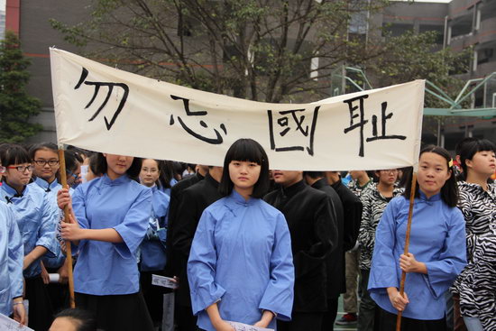 他们打着白布黑字的横幅,拿着自制的标语,在一位学生领袖的带领下,一路高呼“勿忘国耻,振兴中华”。慷慨激昂的演讲,振臂高呼的呐喊,响声雷动,警醒着人们“天下兴亡,匹夫有责”。霎时间,全场沸腾了,仿佛一下回到了那风云激荡的岁月。