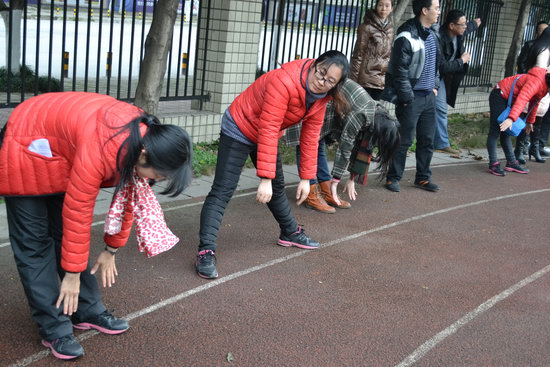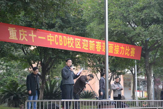 2015年1月11日下午3:00,我校高三年级全体师生在CBD校区操场参加了迎新春迎面接力比赛。为了比赛的安全,体育老师首先组织了一场全年级的热身运动,即将参赛的老师们也加入了热身运动,引来学生们一阵阵的欢笑声。