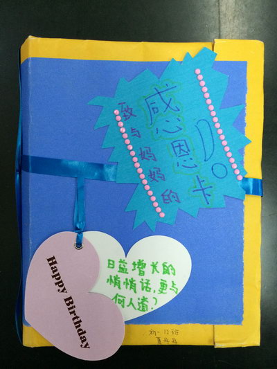 我们始终坚信育人先得学会育心。根据学科特点,我们让学生自主在思品课本上“适应”、“悦己”、“感恩”、“方法”这几大主题中任选一主题进行DIY卡片制作;最后,大家一致选择了“感恩”这一主题。