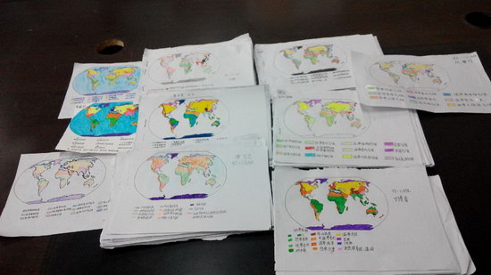 以地图为主题,四张世界地图,让学生将世界七大洲四大洋及世界之最,深深刻在自己的脑海里面,为学生今后学习打下基础。如果只是简单的记忆,学生会感到枯燥,于是,我们结合美术学科,根据所学世界气候类型图进行涂色。此过程,学生兴趣颇大,学生在涂色过程中记忆了不同气候的分布,让学生领悟“过程比结果更重要”。