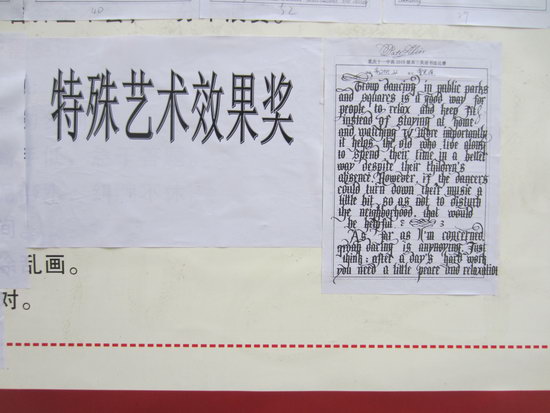 全体老师从一千多份作品中选出了一百来份优秀作品,分设特等奖、一等奖、二等奖和特殊艺术效果奖四个奖项,用四块展板展出。展出期间,学生们对其表现出了极大的兴趣,现场人潮拥挤。也许,我们选出的作品仍然不够完美,也许尚有瑕疵,但我们不满足于做书写之路上的匆匆过客。我们当以学子的赤诚,在这条道路上坚定前行。希望此次活动的成功举办能够在全年级掀起一股书写热潮,从而使我们的学生为六月高考以及漫漫人生路做好更充分的准备。