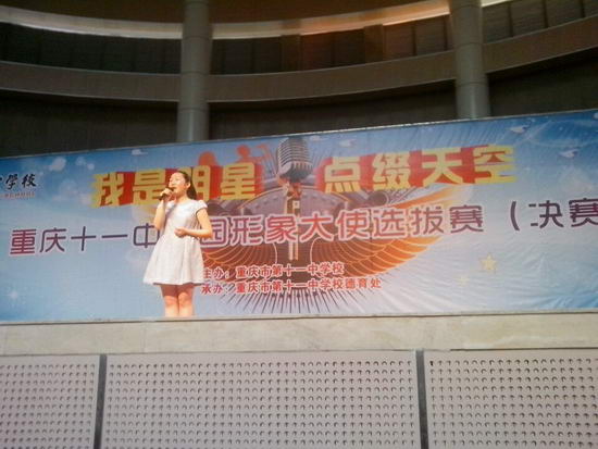 “我是明星,点缀天空”八个亮眼的大字前是斗志昂扬的决赛选手们。我们初2016级14班的选手张小艾同学落落大方的站在台上。