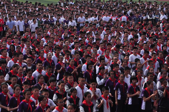烈日炎炎,却抵挡不住十一中学子们前进的脚步。初一初二以及高一高二的同学们精神昂扬,整齐入场后,各个年级的领诵者们使出浑身解数,带动在场的学生齐诵经典,场面壮观。诵读内容从《论语》至《弟子规》的经典篇目选段,最后全校师生合诵《少年中国说》选段,体育场上氛围高涨,学子们铿锵有力的诵读声回响在整个十一中校园,振奋了在场的每一位师生。同时,高2017级九班、十班同学以及重庆十一中高2017级语文实习老师也参与了此次诵读,并展现了实习老师们优雅的风采。