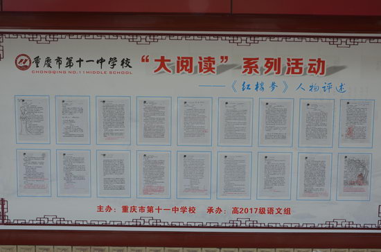 《红楼梦》作文古典四大名著之一,也是高一学生必修课之一,为了促进学生去阅读经典、品味经典、享受经典。高一语文组在胡开波老师和刘世军老师的带领下,于去岁期末开始策划、制定、完善方案。让学生利用假期阅读《红楼梦》及相关研究论著、文章,利用课余时间写红楼人物评述文章、画我心中最美的红楼人物、创作红楼诗词书法作品。经过几个月的精心准备,高一语文组从一千多幅作品中精选出了几十幅进行装裱,并在博文大厅和百米文化墙展出。