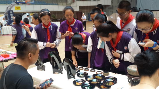 一大早,我校体育馆内就摆放了许多巧夺天工的民间工艺品:根雕、蜀绣、面人、核桃微雕等。活动现场有许多民间艺人,他们与同学们互动、交流,讲解了民间技艺,展示了艺术成品,并带领同学们亲手实践。
