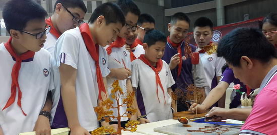 其中,最吸引同学们的是烙画。烙画是利用发热的金属接触薄木板使其碳化的原理绘画,产生茶褐色基调,并运用技巧产生浓淡不同的色彩,绘画出一张张精美的图画。烙画于2014年1月被列入重庆市人民政府公布的第四批市级非物质文化遗产名录。