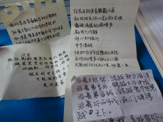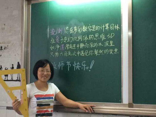 每当一个老师走进来,全班同学就在班长的带领下起立并念出写在黑板上的句子。这些句子,是汇聚了同学们文采的藏头诗。诗中不仅含进了老师们的名字,并且还带有各科特色,例如语文科代表写下的文言,英语科代表的“告白”……老师们看见了十分欣喜与感动,英语老师还发出了“You are so sweet!”的感叹。