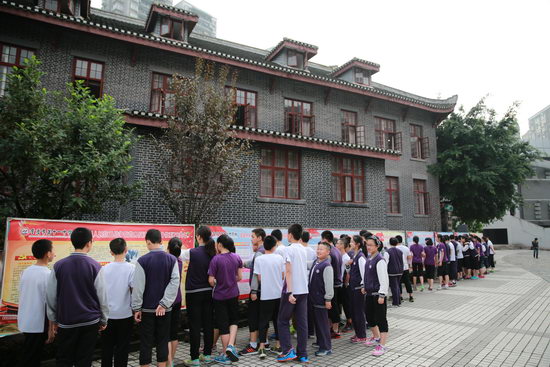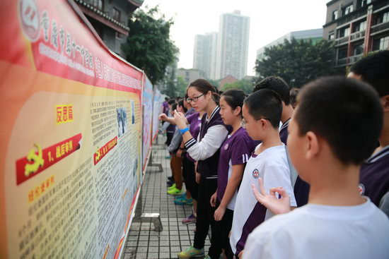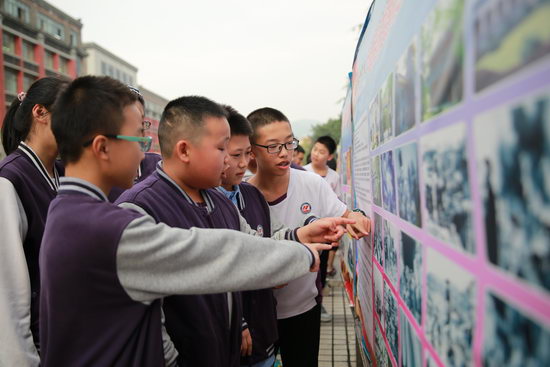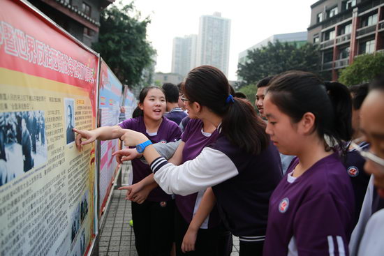 百年精益,肃穆庄重,以“纪念抗日战争暨世界反法西斯战争胜利70周年”为主题的宣传栏吸引着众多学生的目光。大家怀揣敬重之心端详着张张历史悠久的老照片,阅读着行行真切形象的文字,朱德、彭德怀等将军的高大形象走出历史的帷幕,展现在我们面前。同学们还通过重庆大轰炸示意图了解了当年日寇侵华所犯的累累罪行。面对火光冲天的惨景,大家纷纷扼腕叹息,和平真是弥足珍贵!