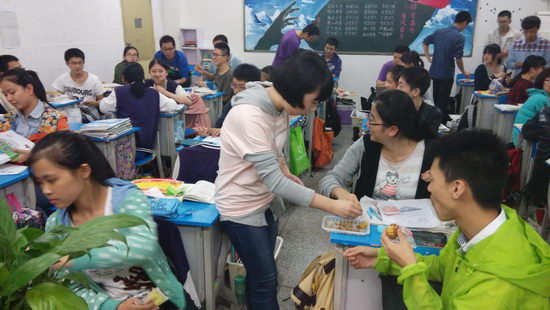 赏月之时,先进个人、优胜小组踩着中秋的月光,登台的领奖,台上的同学扬起收获的笑容,台下的同学响起热烈的掌声。伴着掌声,主持人上台,和着柔和的月光,将“圆”圆满的含义、20班同呼吸共进退的精神和对未来共同的追求结合在一起,赋予这个中秋打动人心,激人上进的力量。言辞完毕,欢笑声扬起,各小组分享着食品,欲在月饼中寄托满满的欢愉,在糍粑中抒咏浓浓的情谊……