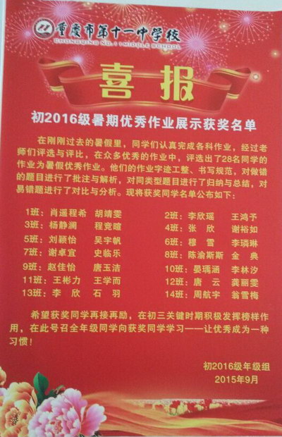 初三开学以来,大家的学习热情十分高涨,同学们就连课间也在座位上忙碌地复习着。但这也需要找到正确的方法和技巧才行。在修德楼四楼和五楼初三的走廊墙上,张贴了两张鲜红的喜报和一张“学霸秘籍”报。我们班的蒋权、黄旖旎在开学考试中进步显著,很荣幸上了其中一张进步显著奖的喜报,他们在学习中,懂得坚持不懈,持之以恒,那么进步便成必然。另一张喜报上表彰的是暑假作业完成优秀的同学,我班的张欣、谢裕如便在其中,她们定在暑假为初三做足了准备。