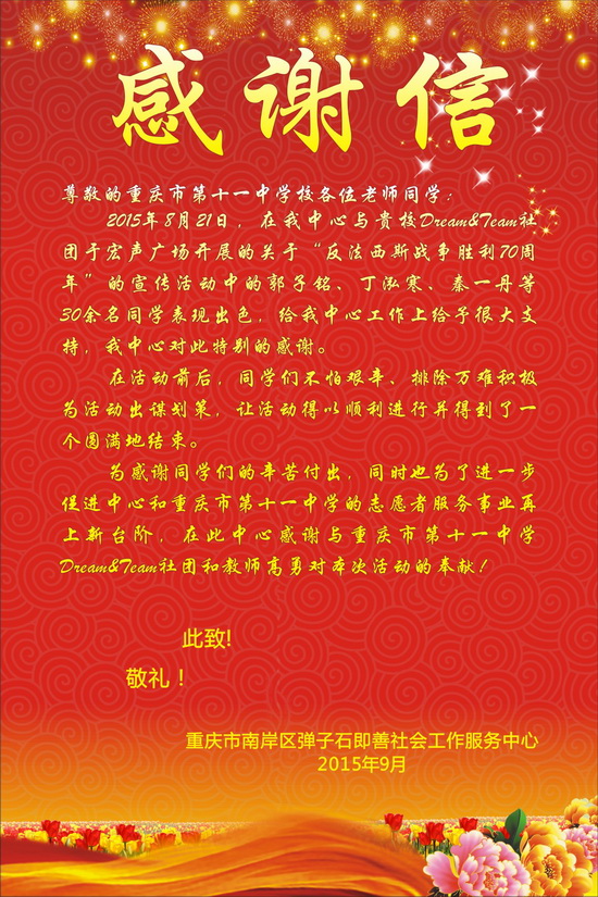 学校收到来自重庆市南岸区弹子石即善社会工作服务中心的感谢信