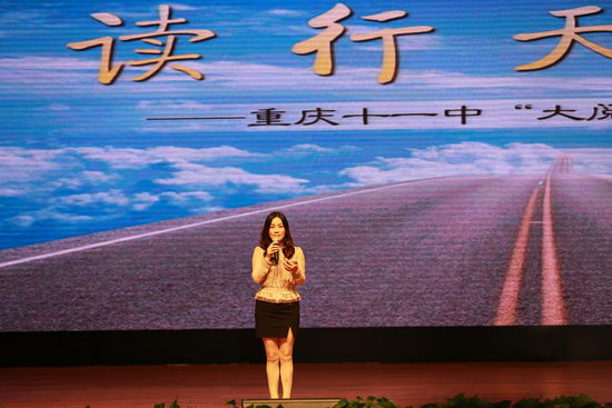 会议议程第二项为分校展示特色项目。重庆市十一中语文教研组教师代表以“读行天下”为题,做了关于“大阅读”的详细报告。展示会由十一中毛阿英老师主持,分为丛书推荐、课程总论、个例展示、学校改革、成果汇演几个部分。