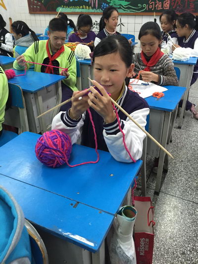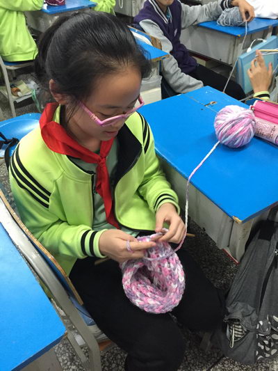 看!初2018级10班正在上DIV手工课呢!同学们都在全神贯注地织围巾,教室里只有竹针碰撞发出的声音。在他们手中,线与线交织着,竹针互相交错,一针、一线,交织组成一个个优美的图案。每张桌上有着不同颜色的毛线,从讲台上望去,真令人眼花缭乱。