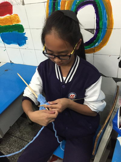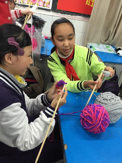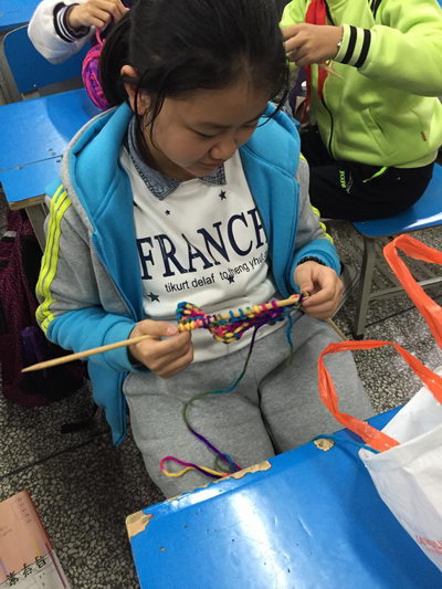 一分一秒正在流逝,同学们有的手忙脚乱,反而打成死结;有的非常灵活,已经织出了明显的花纹;有的还在研究其中的“奥妙”。那些手忙脚乱、还未有成果的只好有去请教老师。看!那里一大群同学正围着老师请教方法呢!其余的同学都在争分夺秒的织着,手法渐渐的熟练起来,织得最好的同学已经织了一大半了,很多同学纷纷表示,自己织的第一条围巾一定要送给自己的爸爸或妈妈。