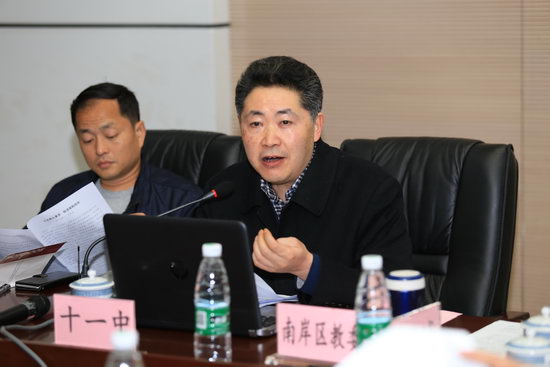 会议开始,由南岸区教育工委书记、教委主任李劲渝代表南岸区教委汇报课程改革工作。李劲渝主任表示,南岸区高中课程改革经历三年发展,已经取得初步成果,最大的收获是培养出了一批有现代教育理念的校长及教师队伍,他们对教育有了更深一步的了解和认识。其中,重庆十一中所进行的积极探索和尝试,是令人惊喜的,重庆十一中通过课程设置的变化以及教学方式的改革,真正让课改落到了实处,为全区课改起了示范作用。