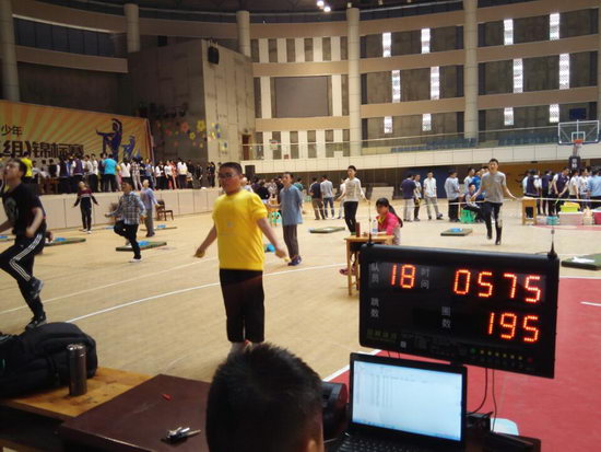 2016年3月7日,重庆十一中体育馆里学生士气昂扬,有的在投掷实心球,有的在跳远,有的在跳绳,犹如在一片竞技场上,原来这是初三年级全体师生正在进行中招体育考试模拟测试。