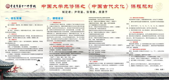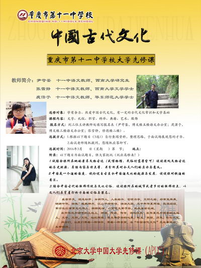三月伊始,在我校大学先修课如火如荼开展的同时,第二批学员的招新工作也拉开帷幕了。《中国古代文化》课率先进行了前期宣传。该课主讲教师尹苛鉴、张雪静、庹潇予精心制作的关于该课的展板和海报赫然立于博文楼和修德楼一楼大厅。