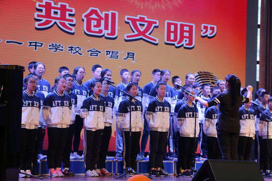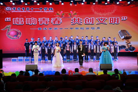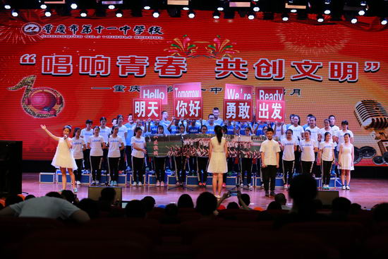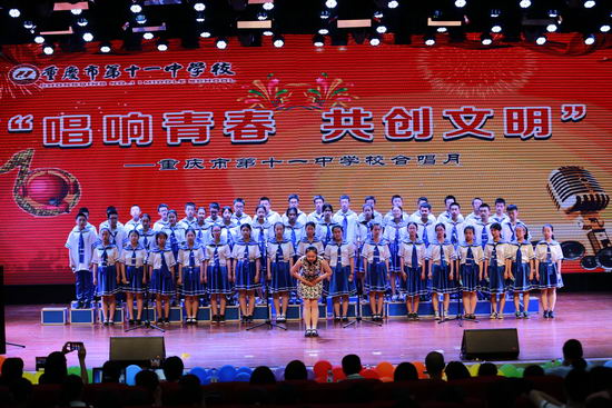 5月12日下午, 重庆十一中“唱响青春,共创文明”合唱比赛在学校文益堂隆重举行。初2017级16个班级全部参加了比赛,体卫艺处副主任李莉等老师担任比赛评委。此次比赛以班级为单位,每班演唱两首歌曲,一首为必选曲目——学校自创歌曲《守则伴我成长》,一首为自选曲目。比赛前老师和同学们进行了精心的准备。