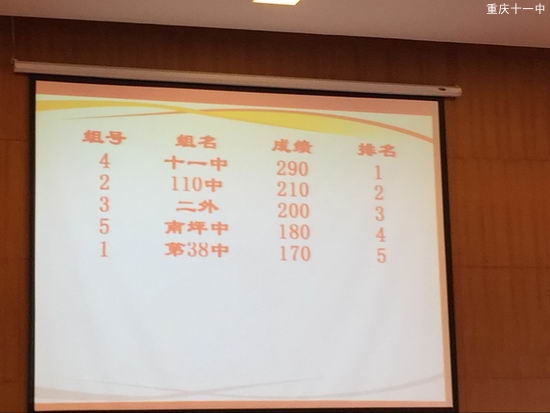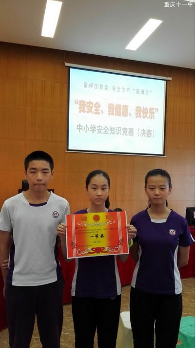 我校初2017级3班何孟瑾、12班黄姿颖、14班邓浩三名学生组队代表十一中参赛。竞赛过程由必答题、抢答题、风险题三个部分组成,其内容涵盖了交通、游泳、饮食、消防、校内活动及面对自然灾害自救自护等方面的安全知识。各代表队步步为营,竞争激烈。最终,我校取得290分的总分,以绝对的优势,获得了一等奖第一名的优异成绩。