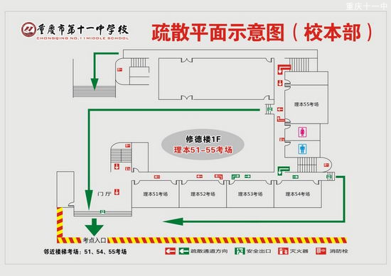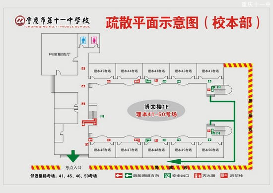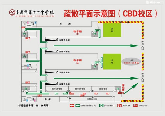1、各考场监考员甲组织考场内考生有序、快速的从前后门离开考场,并告知考生出考场后的疏散线路;监考员乙到考场外走廊上指挥考生按疏散示意图指示方向疏散,邻近楼梯口考场的监考员乙还需到楼梯口指挥考生安全、有序通过本楼梯口。