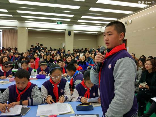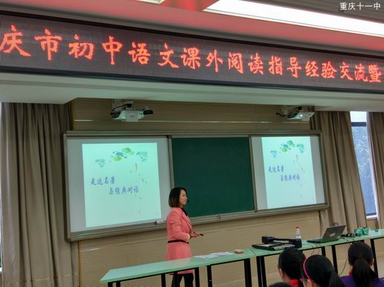 2016年11月15日上午9:00,重庆市第十一中学校修德楼多媒体一室,来自重庆市各个区县的初中语文教师济济一堂,参加“重庆市初中语文课外阅读指导经验交流暨中考质量分析会”,会议由市教研员陈家尧老师主持,会议承办方重庆十一中由初2019级语文备课组的黄莺老师代表与会老师献了一堂名为“走近名著与经典对话”的研讨课。重庆十一中初中语文教研组长雷小利老师、重庆二十九中的特级教师吴莲子老师、长寿区张小平老师、重庆八中唐雨老师、荣昌王老师等教师在会上作了专题发言。