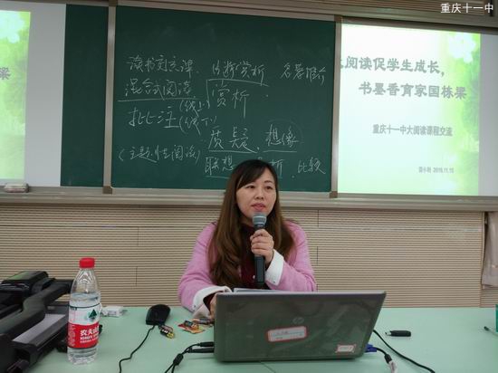 百花齐放,如坐春风。黄莺老师的献课结束之后,市教研员陈家尧老师对这堂课高度评价,并作了点评,指出“课内得法,课外得益”,阅读兴趣的激发对初一的孩子而言,是极其重要的。而后,重庆十一中的雷小利老师代表学校“大阅读课题组”在会上作了大阅读相关情况的发言;重庆二十九的吴莲子老师、长寿区的张小平老师、重庆八中的唐雨老师等老师也在会上作了专题发言。