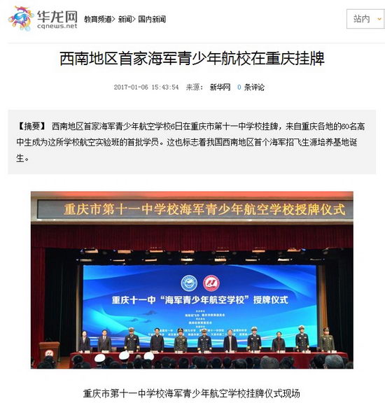 西南地区首家海军青少年航空学校6日在重庆市第十一中学校挂牌,来自重庆各地的60名高中生成为这所学校航空实验班的首批学员。这也标志着我国西南地区首个海军招飞生源培养基地诞生。