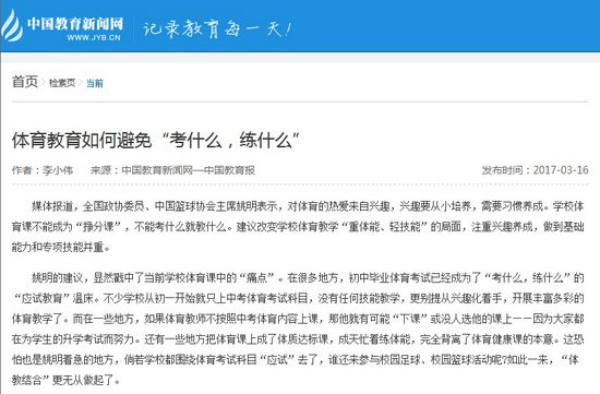 学校体育教学存在的一些问题值得关注,对于“注重兴趣养成,做到基础能力和专项技能并重”的提法,笔者也深表赞同,但对“改变学校体育教学‘重体能、轻技能’的局面”,却不敢苟同。我不知道姚明说这番话的语境和全部内容,但“重体能、轻技能”并不是学校体育的全部,而仅仅是部分地区应试导向的体现。绝大部分的《体育与健康课》还是以技能教学为主,重在培养学生篮球、足球、排球、武术等方面的技能,期望通过体育教学让学生掌握一至两项终身受益的体育项目。