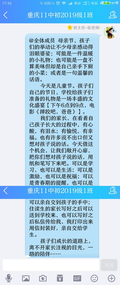 借儿童节来临之际,各班开展了形式丰富多彩的活动。如初2019级1班班主任张燏老师发动家长给孩子们写一封关于“成长”的信;2班班主任胡茜老师则请家长做一张贺卡亲自交给孩子们……不少孩子在收到家长不一样的儿童节礼物时都感动得涕泪四流,纷纷表示过了一个不一样的儿童节。