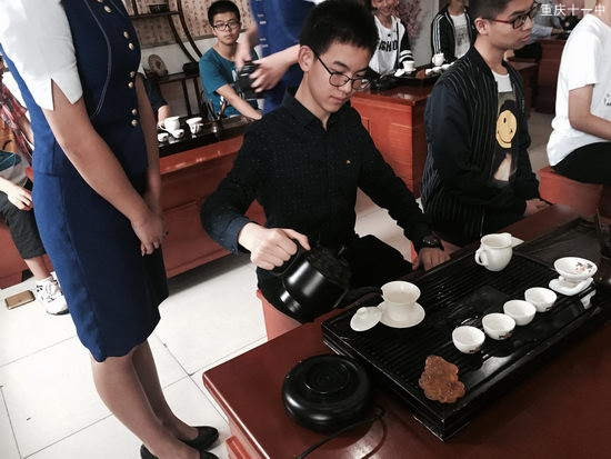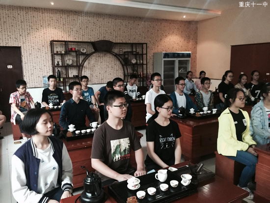 我所在的队伍先进行的内容是茶艺学习。讲课的老师首先请两位高一的姐姐给我们带来了精彩的茶艺表演。两位姐姐的动作娴熟又不失优雅,一举一动都是那么的不疾不徐,仿佛置身于青青翠竹间仰观天下俯察品类。表演结束,大家都拍手称赞。老师也向我们简单说明了茶的种类和茶具的名称。