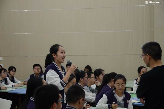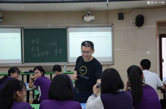 “作文的表达力度”课上,周鹏老师首先提出有力的表达应该“有话不直说,换个说法说”,然后以“时代缺乏一种高贵的精神”这句话的扩展为例,指导学生用引进新元素,利用类推、对比、因果或意象等方式使表达明白清楚、有力动人。课堂上周老师步步深入,学生们积极思考,回答踊跃。