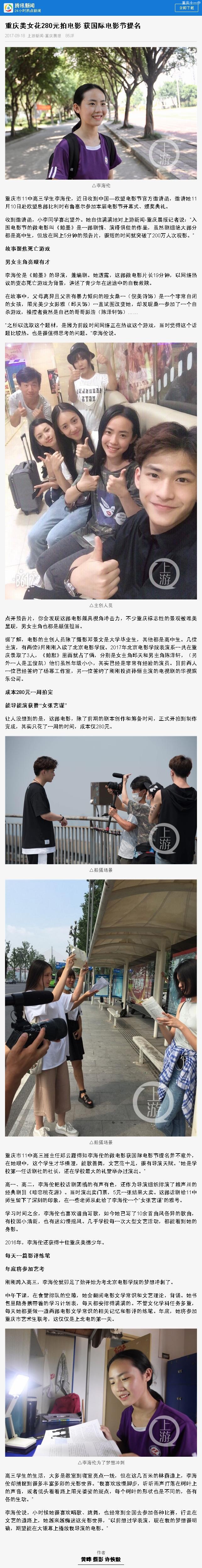 收到邀请函,小李同学喜出望外。她自信满满地对上游新闻-重庆晨报记者说:“入围电影节的微电影叫《鲸墨》是一部剧情、演绎俱佳的作品,虽然剧组绝大部分都是高中生,但放在网上5分钟的预告片,很短的时间就突破了200万人次观影。”